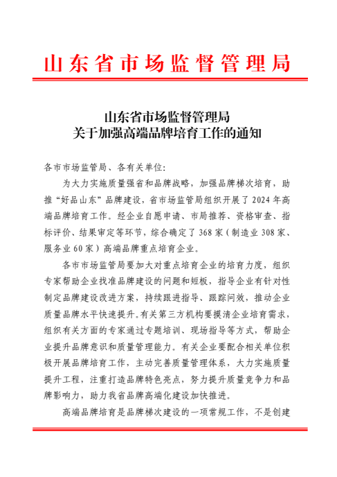 近日,山東省市場監(jiān)管局公布了2024年度山東省高端品牌培育企業(yè)名單,我公司憑借出色的品牌實力與市場競爭力,成功脫穎而出,榮耀入選。